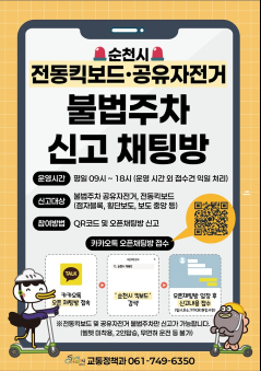 순천시는 시민들의 보행 불편을 해소하고 안전한 보행환경을 조성하기 위해 ‘전동킥보드·공유자전거 불법주차 신고 오픈채팅방’을 9월부터 개설하고 운영에 들어갔다고 8일 밝혔다.