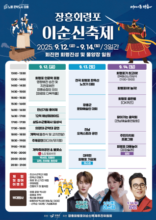장흥군은 12일부터 14일까지 3일간 장흥군 회진면 회령진성 및 회진항 물양장 일원에서 2025 장흥 회령포 이순신 축제를 개최한다.