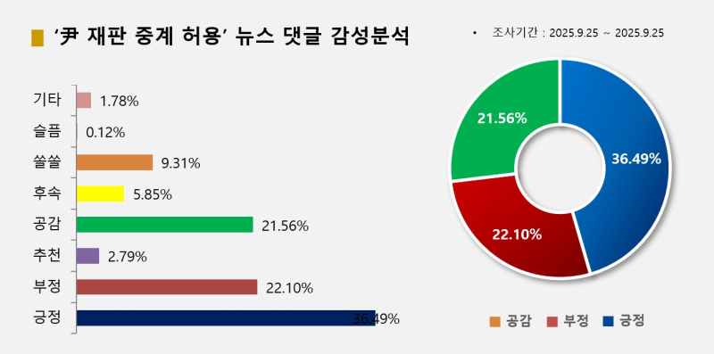 빅터뉴스가 9월 25일 오후 3시까지 '윤석열'과 '중계', '재판', '허용' 키워드로 관련기사를 집계한 결과 포털 네이버와 다음을 기준으로 관련 기사는 모두 105개, 댓글 1532개, 반응 2579개로 집계됐다. 온라인 감성별로 다음의 '좋아요(941개, 51.38%)', '화나요(570개, 22.10%)', 네이버의 '공감백배(556개, 21.56%)' 등의 순이었다.
