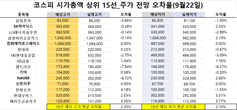 <빅터뉴스 주가 예측> 코스피 시가총액 상위 15선_9월 29일