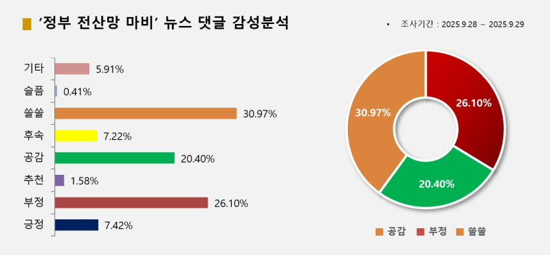 빅터뉴스가 9월 28일부터 29일 오전 11시까지 '국정자원 화재' 키워드로 관련기사를 집계한 결과 포털 네이버와 다음을 기준으로 관련 기사는 모두 2093개, 댓글 3만2628개, 반응 2만5383개로 집계됐다. 온라인 감성별로 네이버의 '쏠쏠정보(7861개, 30.97%)', 다음의 '화나요(6624개, 26.10%)', 네이버의 '공감백배(5178개, 20.40%)' 등의 순이었다.