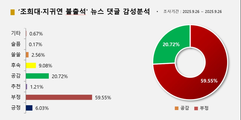 빅터뉴스가 9월 28일부터 29일 낮 12시까지 '조희대'와 '지귀연', '청문회', '불출석' 키워드로 관련기사를 집계한 결과 포털 네이버와 다음을 기준으로 관련 기사는 모두 134개, 댓글 7060개, 반응 1만2597개로 집계됐다. 온라인 감성별로 다음의 '화나요(7502개, 59.55%)', 네이버의 '공감백배(2610개, 20.72%)' 등의 순이었다.