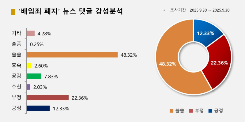 빅터뉴스가 9월 30일 오전 11시까지 '배임죄'와 '폐지' 키워드로 관련기사를 집계한 결과 포털 네이버와 다음을 기준으로 관련 기사는 모두 563개, 댓글 4788개, 반응 3998개로 집계됐다. 온라인 감성별로 네이버의 '쏠쏠정보(1932개, 48.32%)', 다음의 '화나요(894개, 22.36%)', '좋아요(493개,12.33%)' 등의 순이었다.
