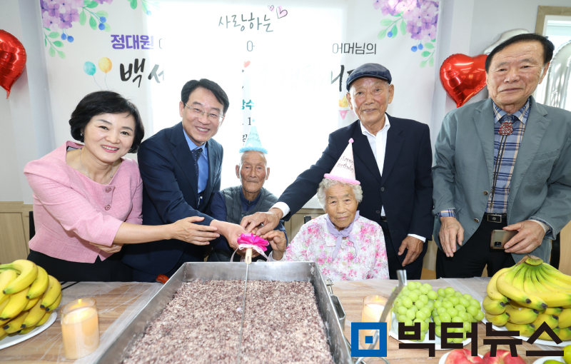 이날 100세 어르신께 드리는 청려장과 함께 과일·참치세트 등 위문품을 전달했으며, 케이크 커팅과 기념촬영을 통해 참석자 모두가 어르신들의 장수를 축하하는 시간을 가졌다.