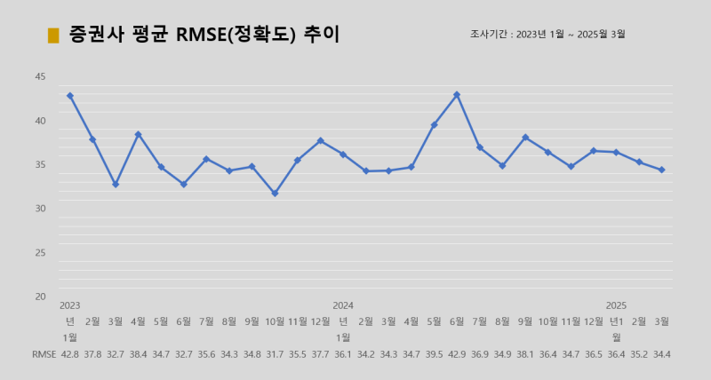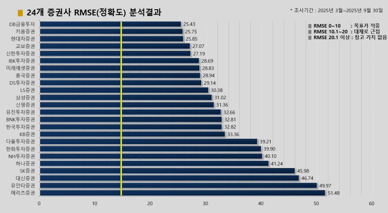 반면 DB금융투자가 RMSE 25.43으로 1위를 차지했고, 키움증권(25.75)과 현대차증권(25.85), 교보증권(27.07), 신한투자증권(27.19) 등이 그 뒤를 따랐다.