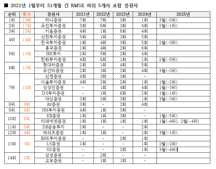 2021년 1월부터 51개월 동안 RMSE 순위가 하위 5개사에 포함된 증권사 가운데 하나증권이 19회로 가장 많았고, 유진투자증권(17회)과 키움증권(15회), 신한투자증권·한국투자증권(14회), 흥국증권·IBK투자증권·한화투자증권(13회) 등이 그 뒤를 이었다.