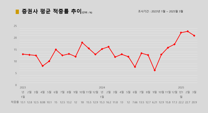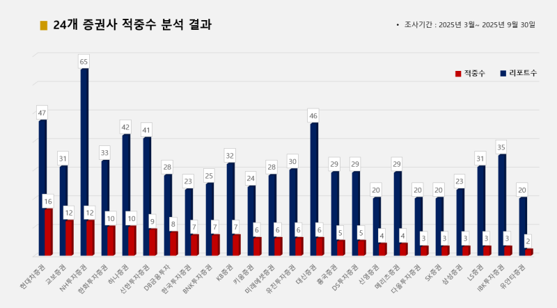 14일 빅터뉴스 부설 비즈빅데이터연구소(BBD랩)의 ‘2025년 3월 증권사 추천 종목 분석’ 보고서에 따르면 24개 증권사가 제시한 목표가와 6개월 후 현재가(2025년 9월 30일 종가 기준)를 비교 분석한 결과 적중한 종목(오차율 ±10% 미만)은 751개 리포트 가운데 157개(적중률 20.91%%)로 나타났다. 이는 전달 적중률(22.71%)보다 낮아진 수치다.