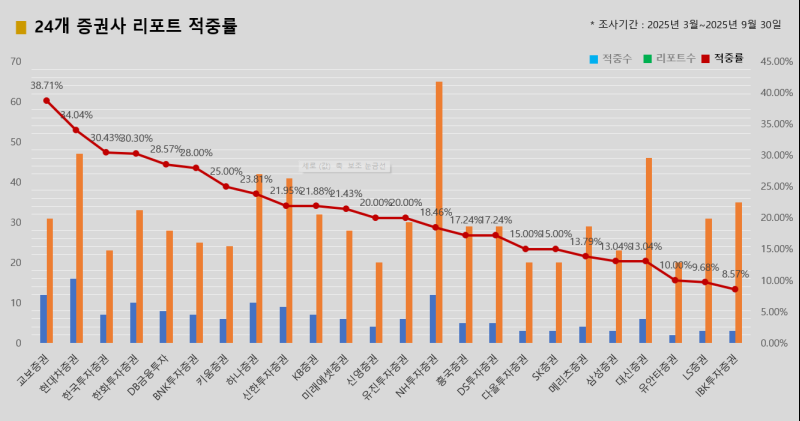 반면 IBK투자증권이 적중률 8.57%로 꼴찌를 기록했고, LS증권(9.68%)과 유안타증권(10%), 대신증권(13.04%), 삼성증권(13.04%)이 그 뒤를 따랐다.
