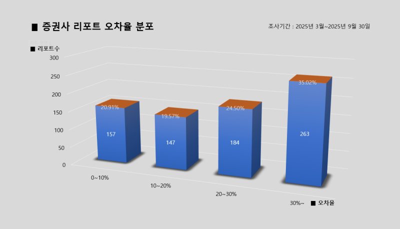 오차율 10~20%는 147종목(19.57%), 20~30%는 184종목(24.5%), 30% 이상은 263종목(35.02%)이었다.