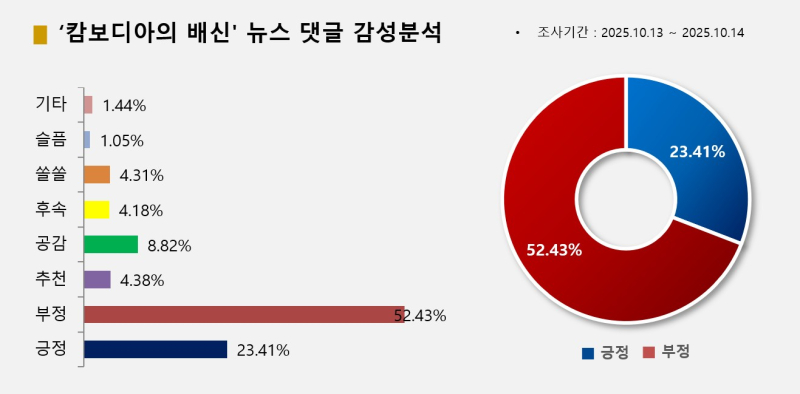 빅터뉴스가 10월 13일부터 14일 오전 10시까지 '캄보디아'와 '군사', '작전', '국회' 키워드로 관련기사를 집계한 결과 포털 네이버와 다음을 기준으로 관련 기사는 모두 79개, 댓글 2069개, 반응 4593개로 집계됐다. 온라인 감성별로 다음의 '화나요(2408개, 52.43%)', 네이버의 '공감백배(1075개, 23.41%)' 등의 순이었다.