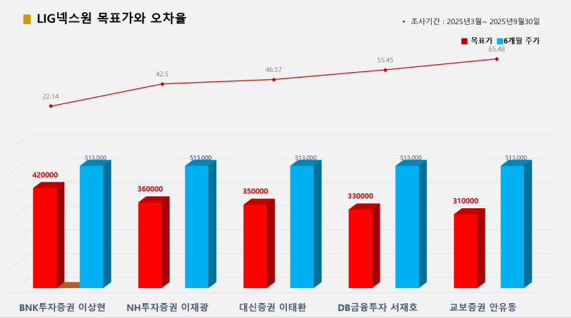 5개 증권사가 추천한 LIG넥스원의 경우 교보증권 안유동 애널리스트가 목표가(31만원) 대비 종가(51만3000원) 오차율 65.48%로 꼴찌를 기록했고, DB금융투자 서재호 애널리스트가 오차율 55.45%로 그 뒤를 이었다.