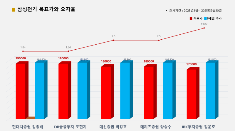 5개 증권사가 추천한 삼성전기의 경우 현대차증권 김종배·DB금융투자 조현지 애널리스트가 목표가(19만원) 대비 종가(19만3500원) 오차율 1.84%로 적중시켜 공동 1위에 올랐고, 대신증권 박강호·메리츠증권 양승수 애널리스트가 오차율 7.5%로 그 뒤를 이었다.