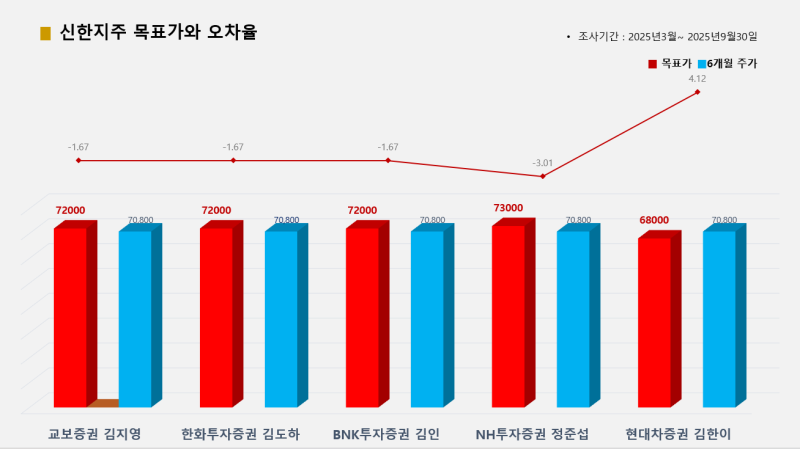 5개 증권사가 추천한 신한지주의 경우 교보증권 김지영·한화투자증권 김도하·BNK투자증권 김인 애널리스트가 목표가(7만2000원) 대비 종가(7만800원) 오차율 –1.67%로 적중시켜 공동 1위에 올랐고, NH투자증권 정준섭 애널리스트가 오차율 –3.01%로 그 뒤를 이었다.
