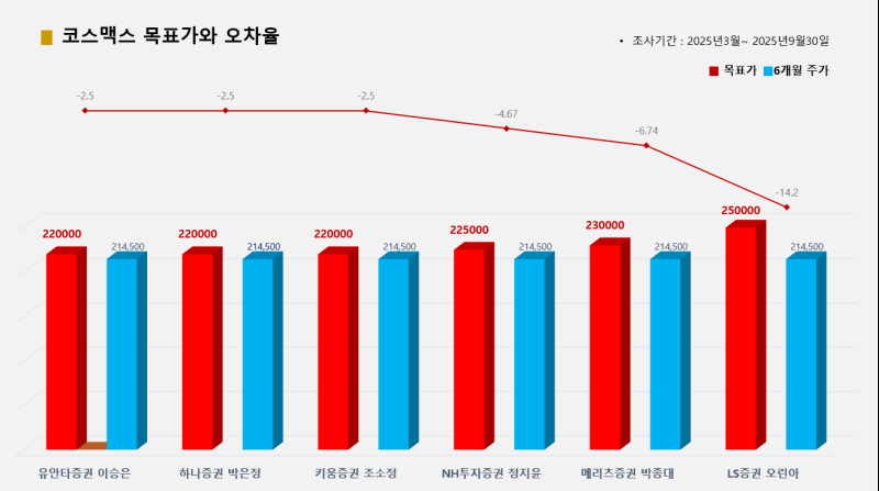 6개 증권사가 추천한 코스맥스의 경우 유안타증권 이승은·하나증권 박은정·키움증권 조소정 준 애널리스트가 목표가(22만원) 대비 종가(21만4500원) 오차율 -2.5%로 적중시켜 공동 1위에 올랐고, NH투자증권 정지윤 애널리스트가 오차율 –4.67%로 그 뒤를 이었다.