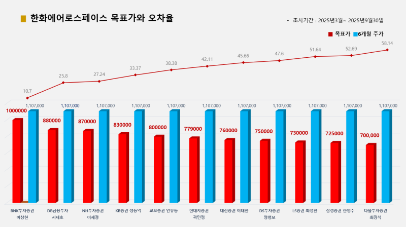 11개 증권사가 추천한 한화에어로스페이스의 경우 다올투자증권 최광식 애널리스트가 목표가(70만원) 대비 종가(110만7000원) 오차율 58.14%로 꼴찌를 기록했고, 삼성증권 한영수 애널리스트가 오차율 52.69로 그 뒤를 이었다.