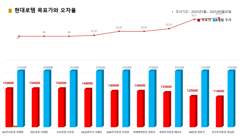 9개 증권사가 추천한 현대로템의 경우 한국투자증권 장남현 애널리스트가 목표가(11만8000원) 대비 종가(21만9000원) 오차율 85.59%로 적중시켜 1위에 올랐고, KB증권 정동익 애널리스트가 오차율 82.5%로 그 뒤를 이었다.