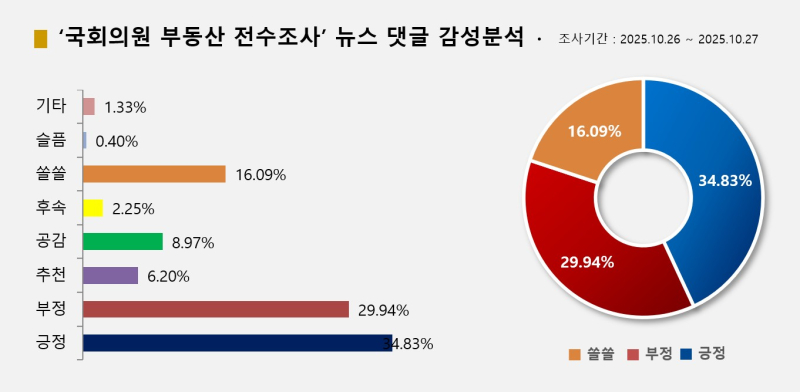빅터뉴스가 10월 26일부터 27일 오전 10시까지 '전수조사'와 '부동산', '국회의원' 키워드로 관련기사를 집계한 결과 포털 네이버와 다음을 기준으로 관련 기사는 모두 191개, 댓글 7214개, 반응 1만1381개로 집계됐다. 온라인 감성별로 다음의 '좋아요(3964개, 34.83%)', '화나요(3407개, 29.94%)', 네이버의 '후속강추(1831개, 16.09%)' 등의 순이었다.