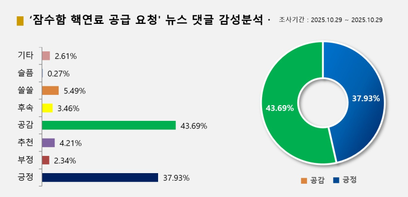 빅터뉴스가 10월 29일 오후 4시까지 '트럼프'와 '핵추진', '잠수함' 키워드로 관련기사를 집계한 결과 포털 네이버와 다음을 기준으로 관련 기사는 모두 124개, 댓글 1107개, 반응 1877개로 집계됐다. 온라인 감성별로 네이버의 '공감백배(820개, 43.69%)', 다음의 '좋아요(712개, 37.93%)' 등의 순이었다.